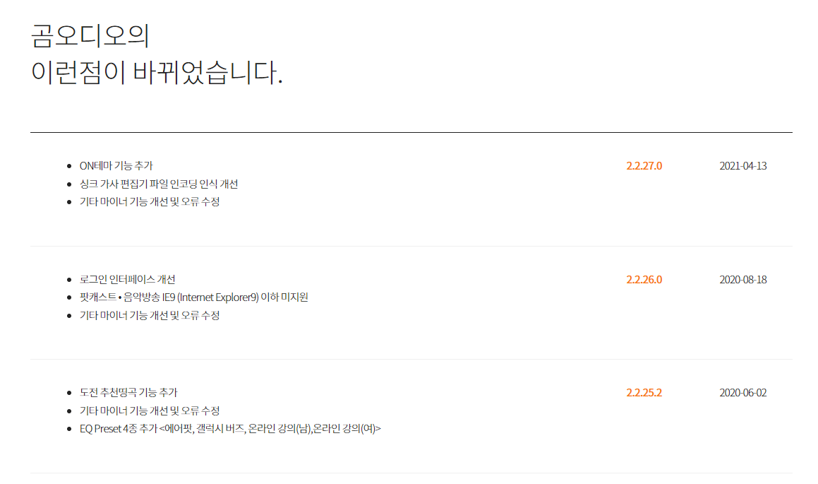 7. 곰오디오 또한 프로그램이기 때문에 업데이트를 통해 지속적으로 변해오고 있습니다. 추가 혹은 개선된 기능들에 대한 간략한 내용을 확인할 수 있습니다.
