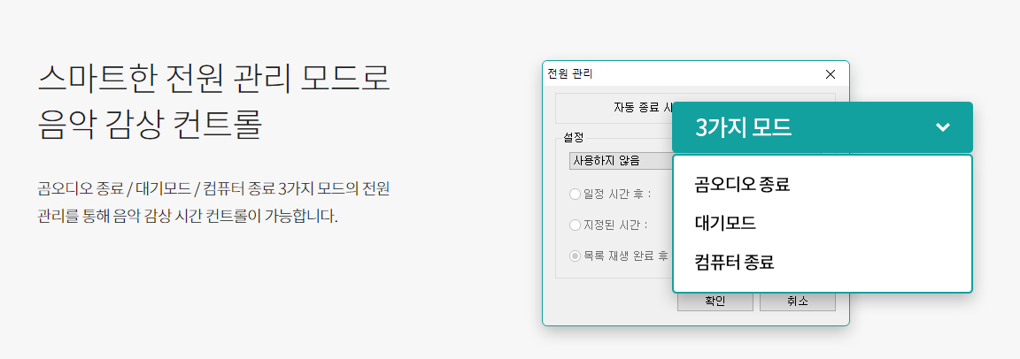 4. 곰오디오에서는 전원 관리 모드가 잇는데요. 곰오디오 종료 / 대기 모드 / 컴퓨터 종료로 3가지의 기능을 제공합니다.