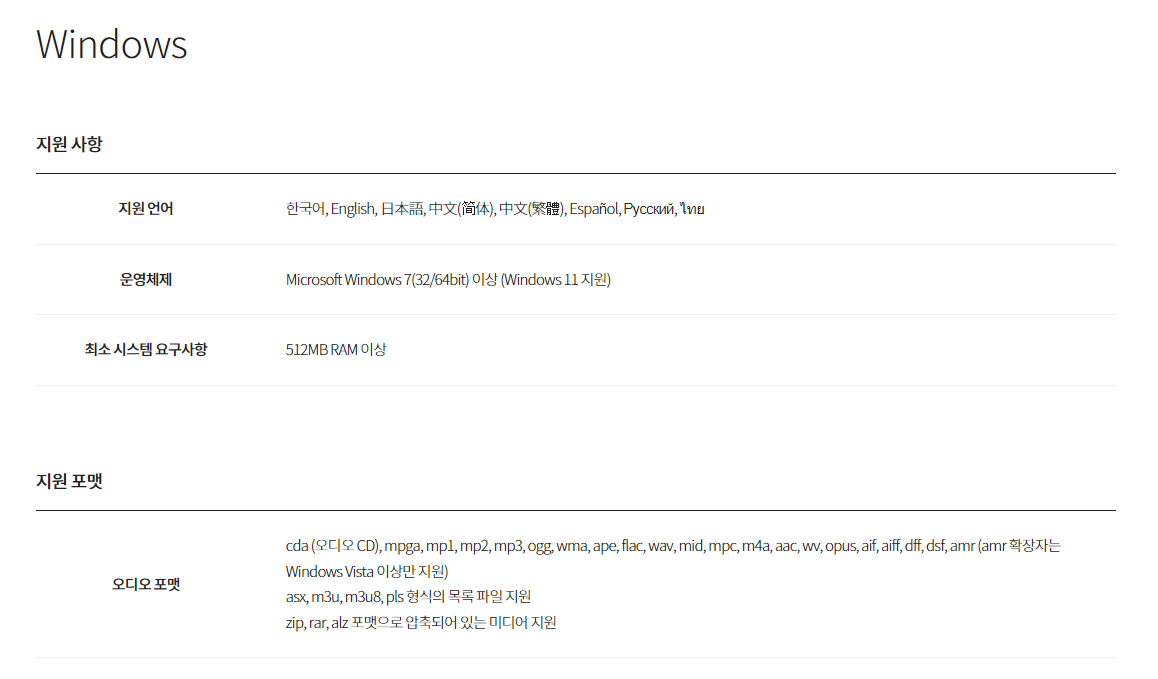 6. 곰오디오의 윈도우 사양은 아래 사진과 같습니다. 윈도우 7이상 윈도우 11지원이 가능하며, 512mb 이상의 메모리가 잇으면 됩니다. 요즘 컴퓨터는 대부분 메모리가 넘치니 사양이 부족해서 프로그램을 사용하지 못하는 경우는 드물 것 같네요.