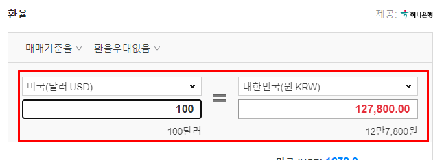 6. 아래 사진에서 붉게 표시된 부분에 원하는 달러를 입력하면 원화로 계산된 결과를 확인할 수 있습니다. 글 쓰는 기준 100달러는 127,800원이네요.