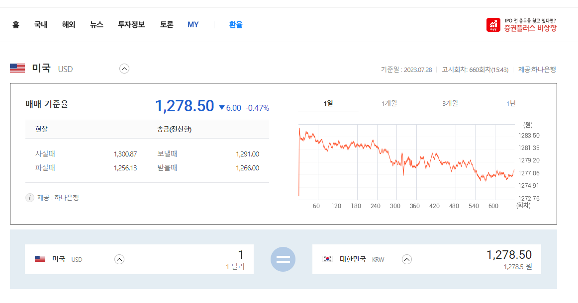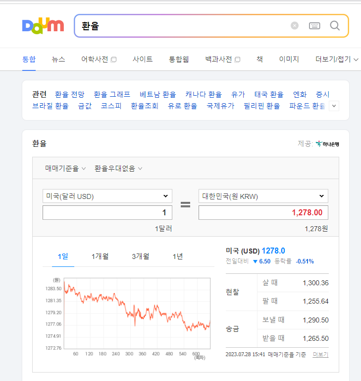 5. 다음에서도 환율 기능을 검색해 활용할 수 있습니다. 환율이라고 검색하면 아래 사진과 같이 정보를 확인할 수 있습니다.