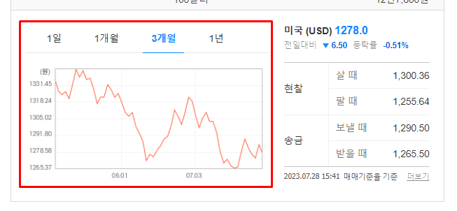7. 해당 영역에는 1일, 1개월, 3개월, 1년을 단위로 환율의 변화 그래프를 확인할 수 있습니다. 더 상세하게 확인하고 싶다면 '더보기'를 클릭합니다.