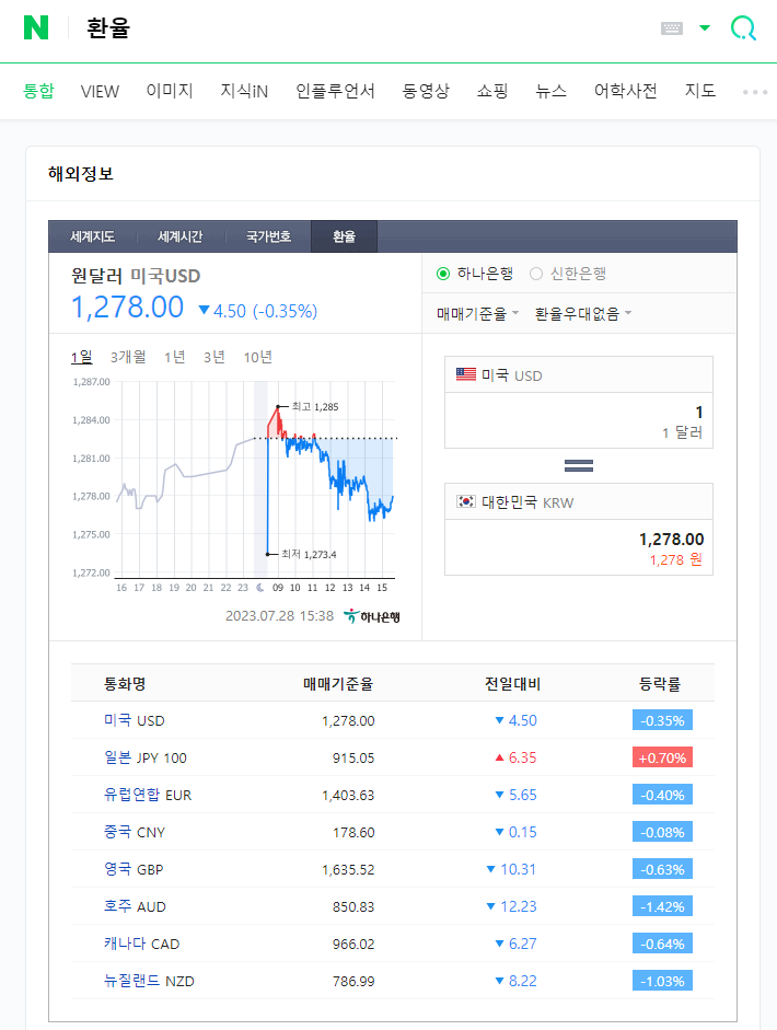 3. 검색 결과에는 환율에 대한 정보를 제공하고 있습니다. '해외정보'라는 영역으로 구분되어 있네요. 해당 영역에는 기본적으로 1달러를 원화로 변환하여 표시해 줍니다.