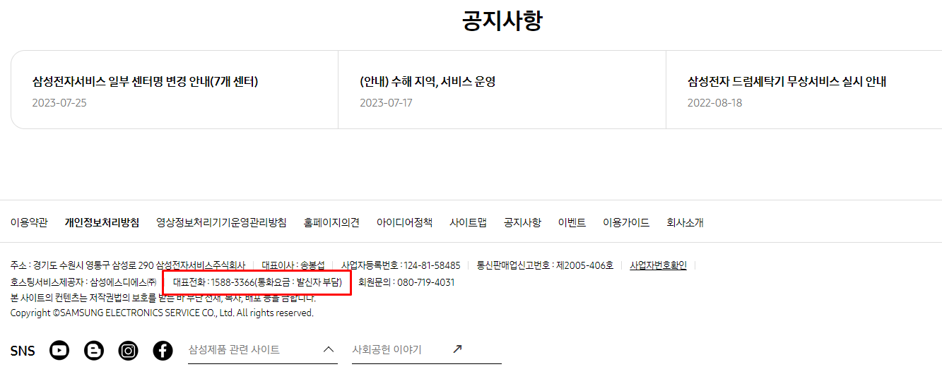 3. 스크롤을 계속 내려 페이지 화면 하단으로 이동합니다. 아래 사진과 같이 대표전화, 1588-3366을 찾을 수 있습니다.