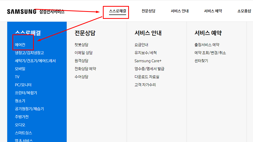 4. 또는 스스로해결하기를 통해 문제점을 찾아볼 수 있습니다. 아래 사진과 같이 메뉴 중 [스스로해결 > 에어컨]을 선택합니다.