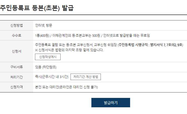 위 사진은 주민등록등본 인터넷 발급을 신청하기 전 등장하는 간략한 안내사항입니다. [신청방법 / 수수료 / 신청서 / 구비서류 / 처리기간 / 신청자격]으로 구분되어 안내되어 있습니다. 페이지 하단에는 또 다른 내용도 있는데요. 위 사진에서 보여지는 정보가 가장 중요한 내용이기도 하겠죠.
