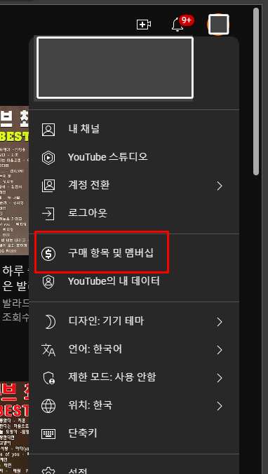 2. 유튜브 홈페이지에 접속한 후, 로그인을 합니다. 오른쪽 상단에 보면 프로필이 보이게 됩니다. 클릭하면 여러 메뉴들을 확인할 수 있습니다.(아래 사진 참조) 항목 중 멤버십이라는 메뉴를 클릭합니다.