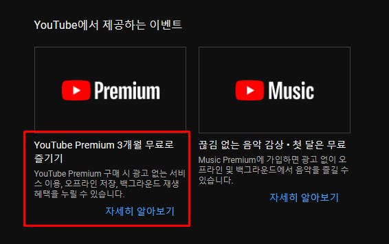 3. 페이지가 넘어가면 아래 사진과 같은 모습을 확인할 수 있습니다. 유튜브에서 제공하는 기능으로 프리미엄과 뮤직이 있는데요. 우리는 프리미엄에 관련된 정보를 찾아보면 되겠습니다.