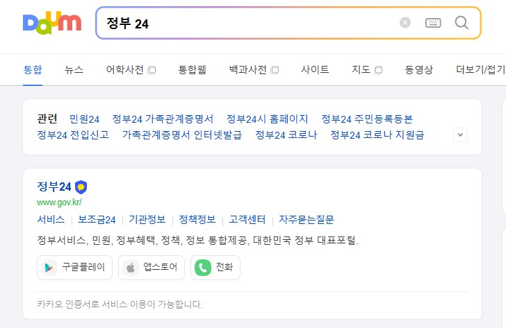 1. 정부 24 홈페이지를 이용하게 됩니다. 다음 검색을 통해 정부 24 홈페이지를 찾아 접속하도록 합니다.