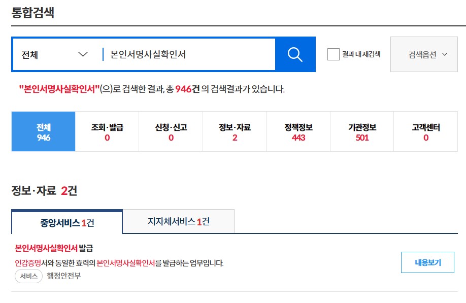 3. 정보 및 자료 영역을 확인하면 검색된 결과인 본인서명확인서발급 메뉴가 있습니다.