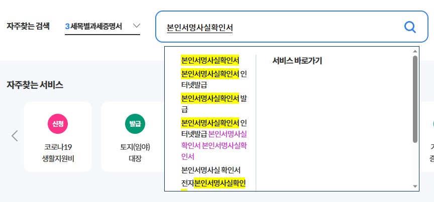 2. 사이트의 메인 화면에서는 다양한 기능과 안내가 있습니다. 메뉴바를 이용해도 되지만, 검색을 이용하면 보다 빠르게 필요한 기능을 찾을 수 있습니다. 아래 사진과 같이 '본인서명사실확인서'를 검색합니다.