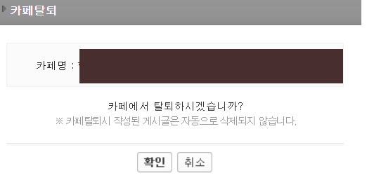 탈퇴하기를 선택하면 위 사진과 같이 확인 절차를 보여지게 됩니다. 실수로 클릭하는 경우도 있겠죠. '확인'을 선택하면 해당 네이버 카페에서 탈퇴할 수 있습니다.